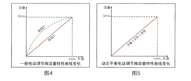 動(dòng)態(tài)平衡電動(dòng)調(diào)節(jié)閥由于獨(dú)特的閥體結(jié)構(gòu),在實(shí)際的使用工作中閥權(quán)度基本為1,因此其實(shí)際的流量特性曲線與理想的流量特性曲線一致(如圖5),沒有偏離,因此具有優(yōu)良的電動(dòng)調(diào)節(jié)功能。